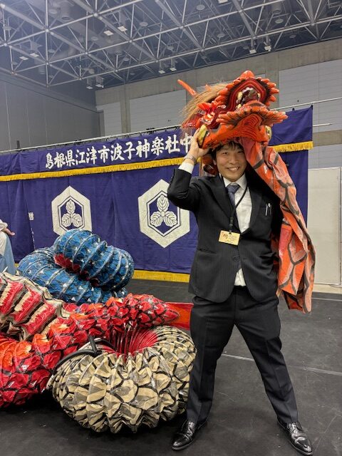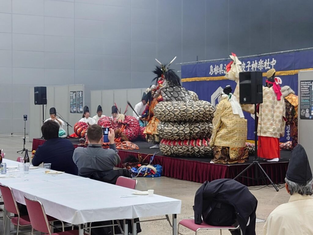 バンケットの催し物では、石見神楽が演じられていました。私の出身は島根県西部(石見)の浜田市で、中学校の学際の出し物で石見神楽の翁を演じたことがあり、懐かしく感じましたが、私の演じていた神楽と異なり、やはりプロの演技は圧巻でした。